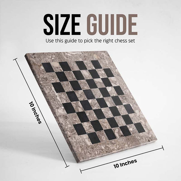 - SIZE - Board Size: 10 Inches. King Measures: 2 Inches. Queen: 1.8 Inches. Bishop: 1.75 Inches. Knight: 1.75 Inches. Rook: 1.75 Inches. Pawns: 1.5 Inches. The Chess Board Comes Along with an Attached Felt Bottom to Avoid Scratches. Separate Felt Bottoms Packet For All Chess Figures.