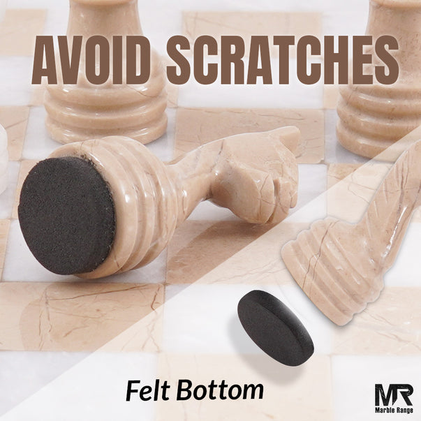 • SIZE Board Size - 12 Inches. King Measures: 2.75 Inches. Queen: 2.5 Inches. Bishop: 2.25 Inches. Knight: 2.25 Inches. Rook: 2.25 Inches. Pawns: 2 Inches. The Chess Board comes along with an attached felt bottom to avoid scratches. Separate felt bottoms packet for all chess figures.