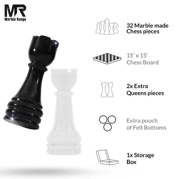 - WHAT IS INCLUDED - 1 x Chess Board & 32 x Chess Figures + 2 Extra Queens, 2 Kings, 2 Queens, 4 Knights, 4 Bishops, 4 Rooks, 16 Pawns. Comes Along Free Storage Box & Marble Range Branded Secure & Fragile Packaging.