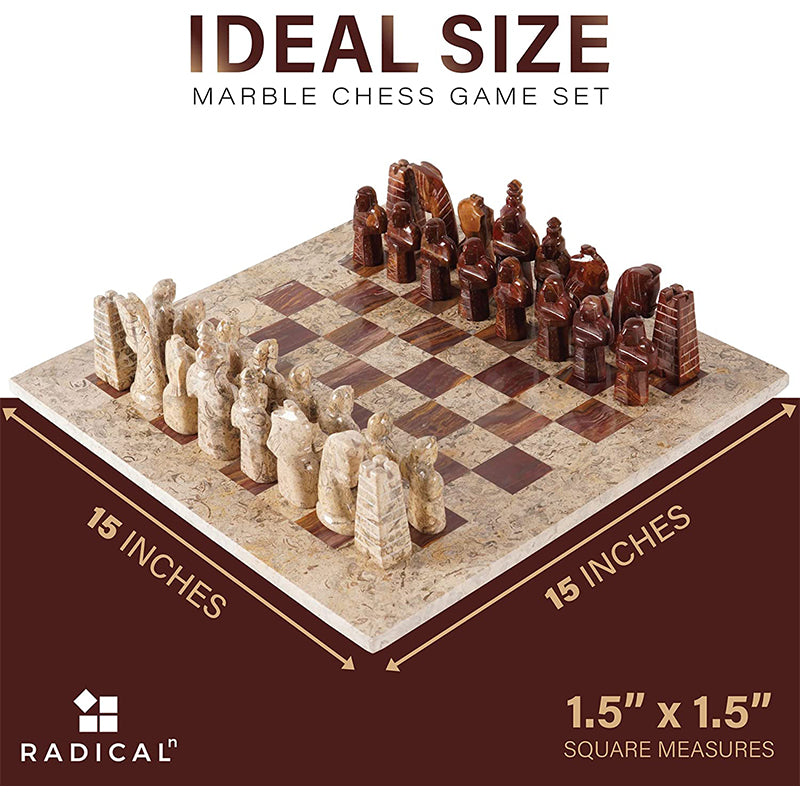 • ♛SIZE♛ - Board Size: 15 Inches. King Measures: 3.75 Inches. Queen: 3.25 Inches. Bishop: 2.5 Inches. Knight: 2.75 Inches. Rook 2.5 Inches, Pawns: 2.25 Inches. The Chess Board comes along with an attached felt bottom to avoid scratches. Separate felt bottoms packet for all chess figures.